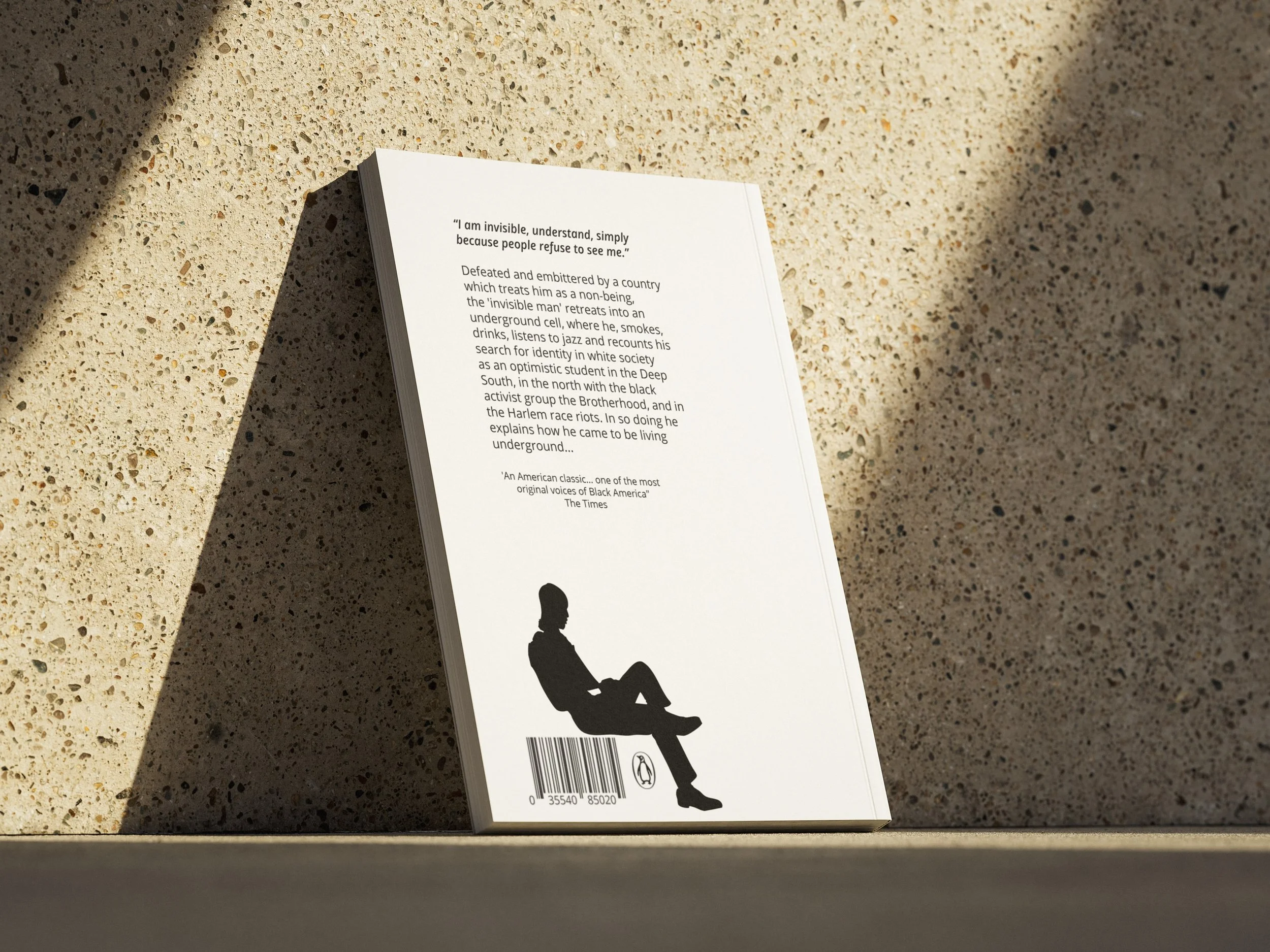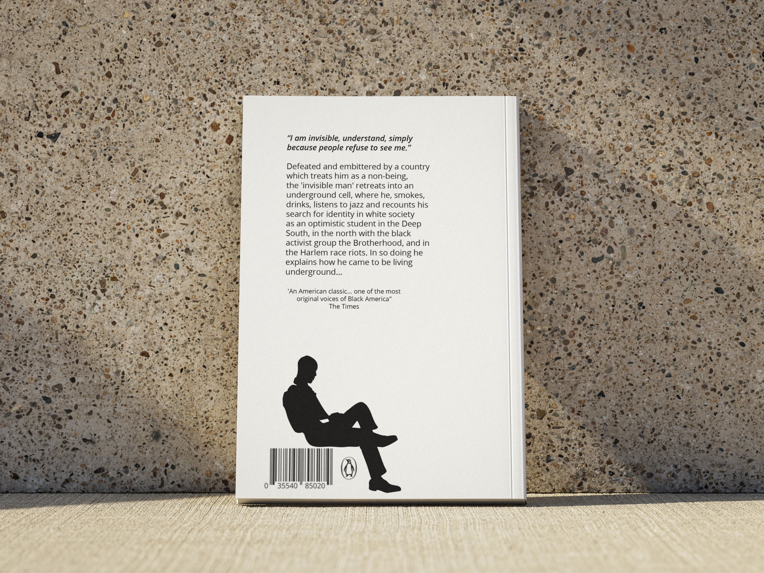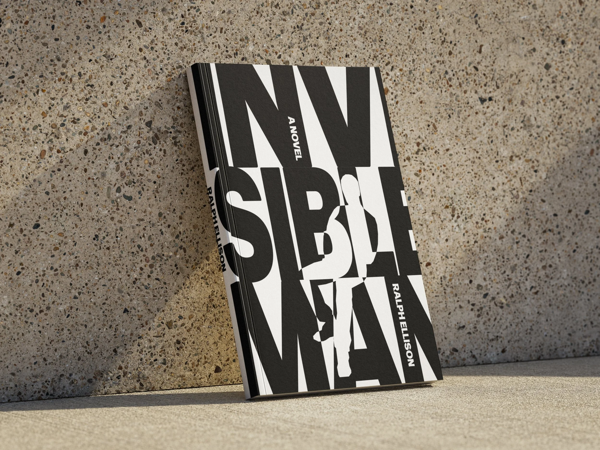 This book cover reimagines Invisible Man by Ralph Ellison. I used overlapping, broken typography to reflect the novel’s theme of invisibility and fragmented identity. I thought it would be interesting to incorporate a silhouette into the type itself to show the idea of being hidden within society, while keeping the design bold and modern.
