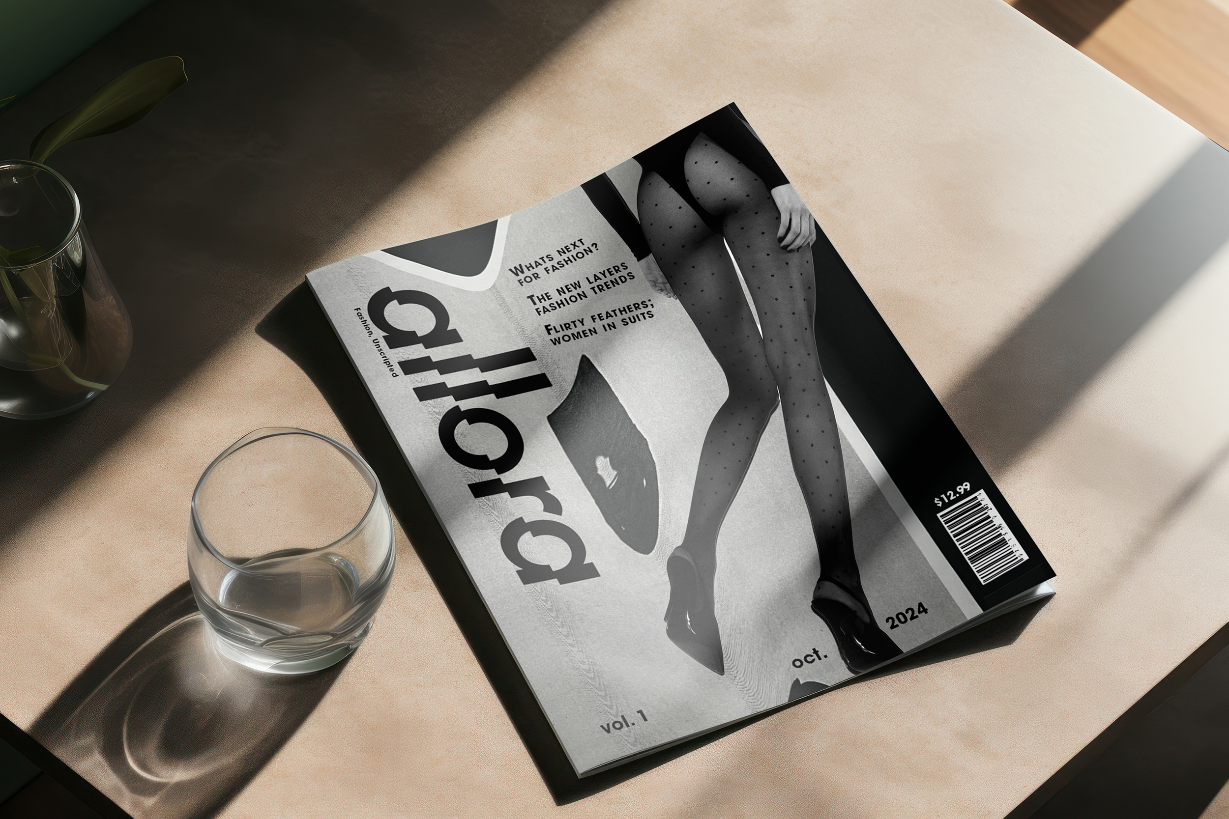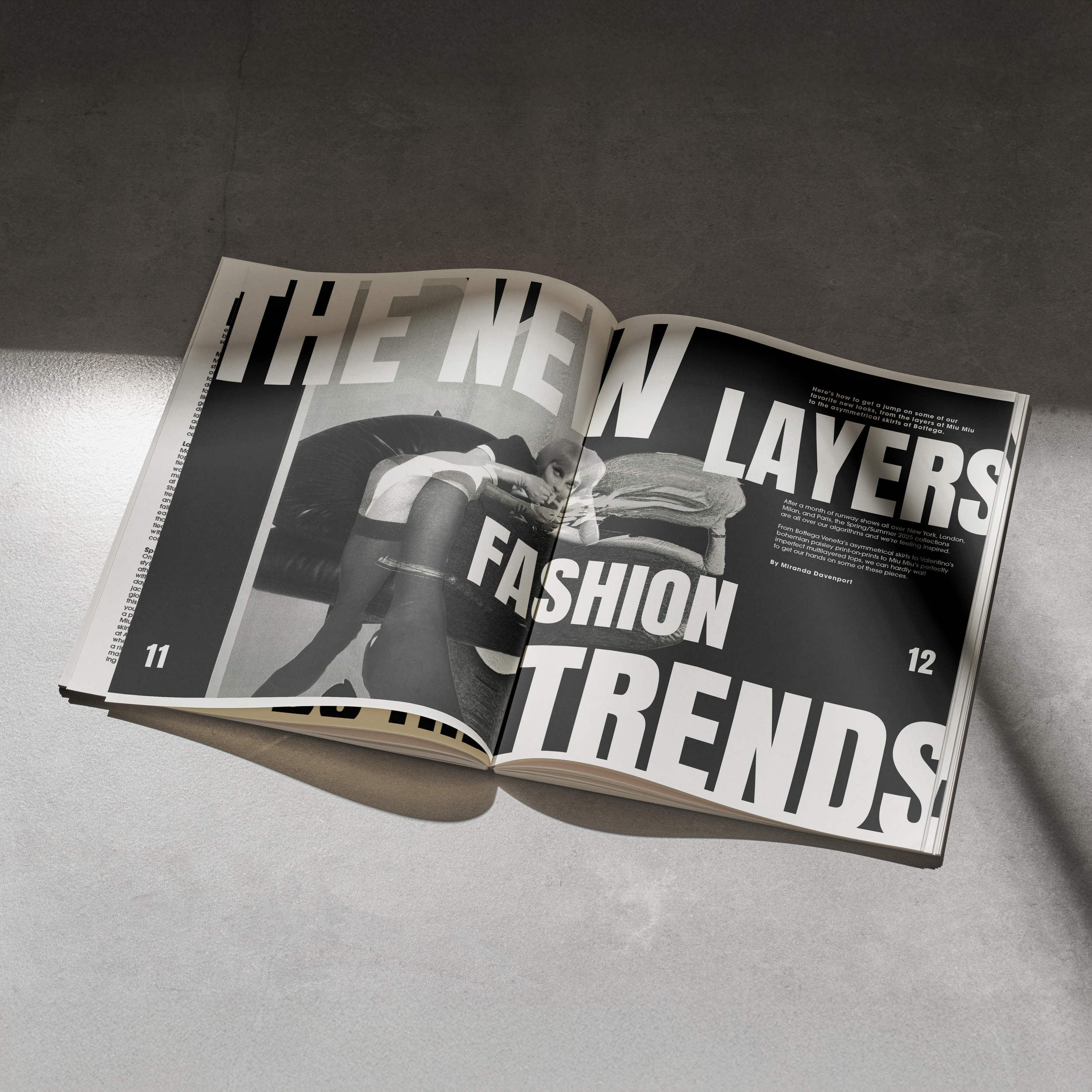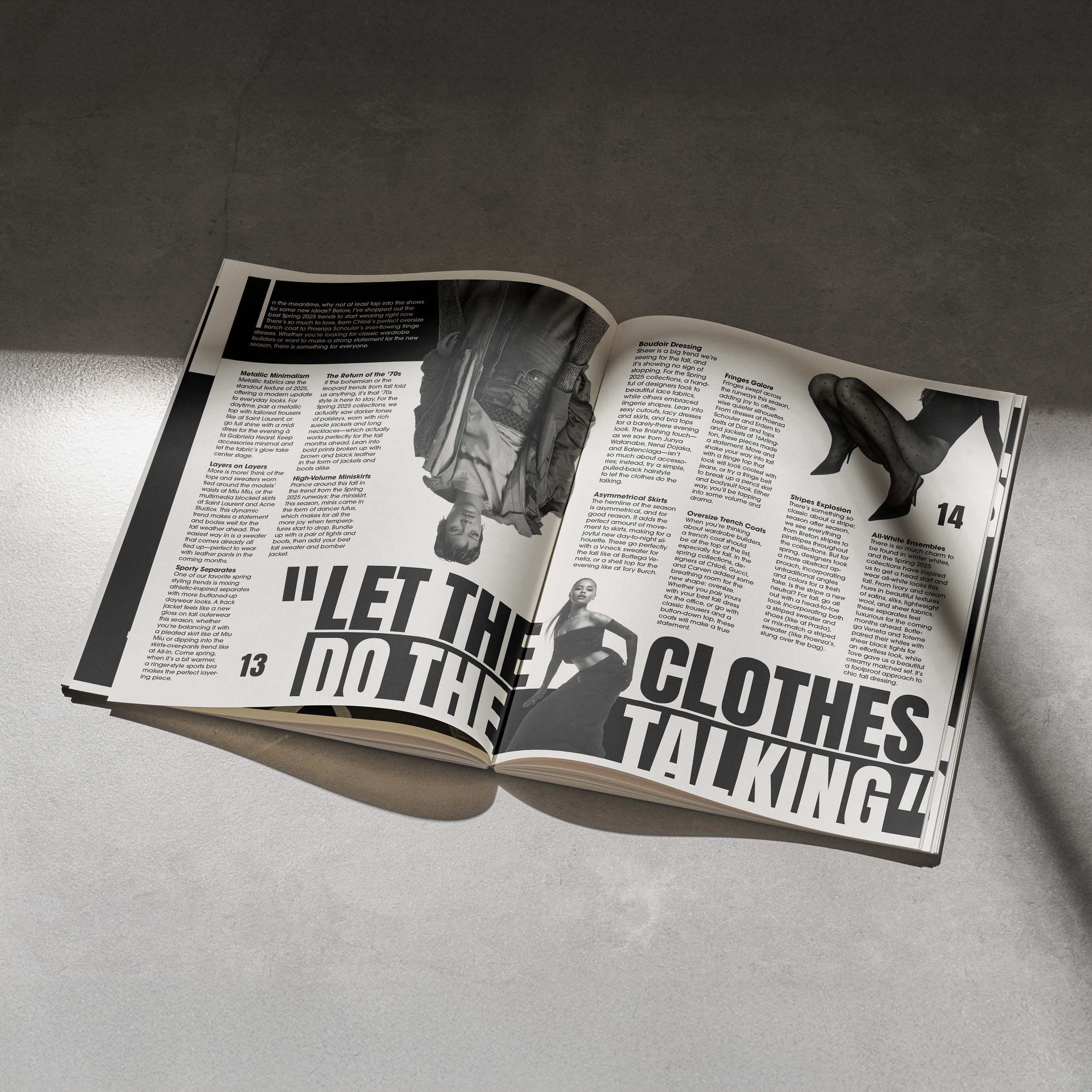 Allora is a fashion magazine that taps into trending styles. Fashion is about experimentation and having fun with what you wear. I wanted to incorporate that logic into the imagery and type in these spreads. I printed out my sourced photos, and then played with them on a copy machine. I got some cool distorted effects that I wouldn’t have been able to get digitally. Being able to physically touch my work also often helps to make it feel more personal.